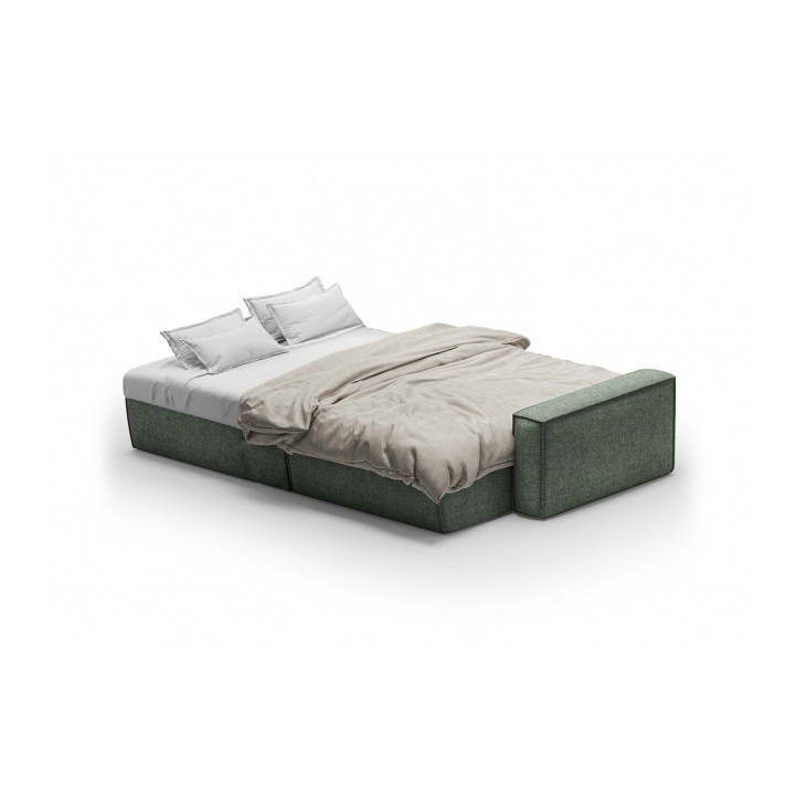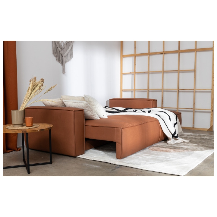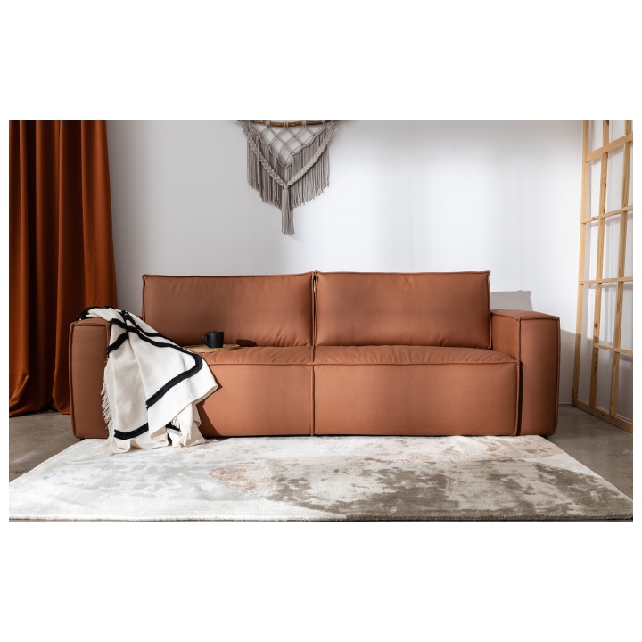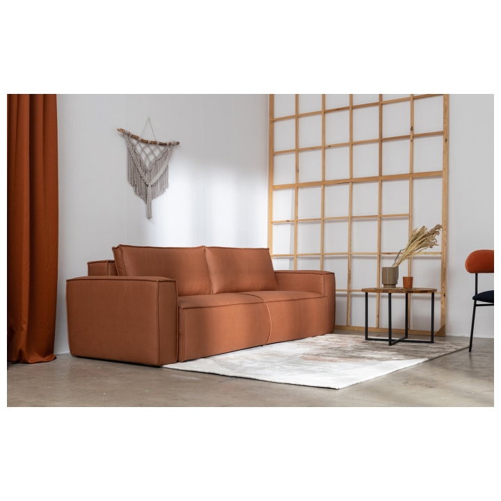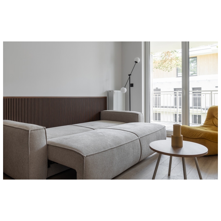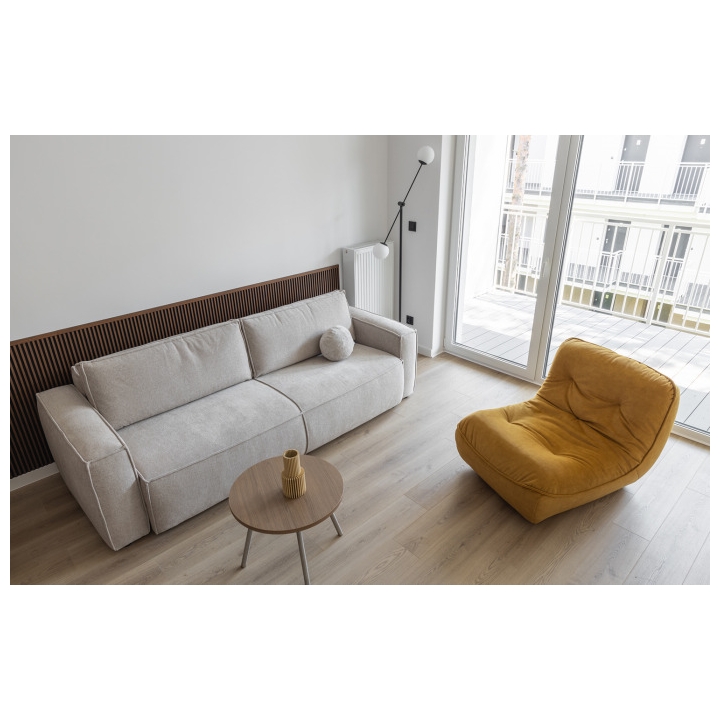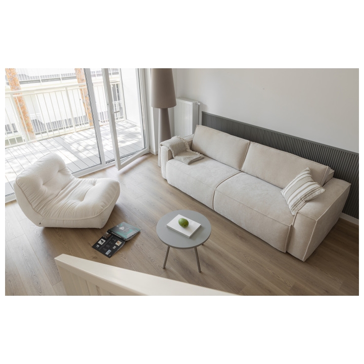 Softi is a three-seater modern lounge furniture that will sensationally complement the space in your living room. The furniture features a soft comfortable seat, filled with highoeast foam and a corrugated spring. Comfort is also ensured by large and soft backrest cushions made of silicone inserts. The greatest advantages of this product will therefore be its universal, minimalist form, which will prove sensational in many arrangements. The furniture is equipped with a useful DL sleeping function, which will allow it to be quickly transformed into a comfortable bed. This function is complemented by a bedding container, allowing you to conveniently store all your textiles. Do you want to furnish your interior with a friendly space for your household members to spend time in pleasantly? With Softi sofa it is possible! A wide range of fabric colours will make you match the furniture to your favourite style!