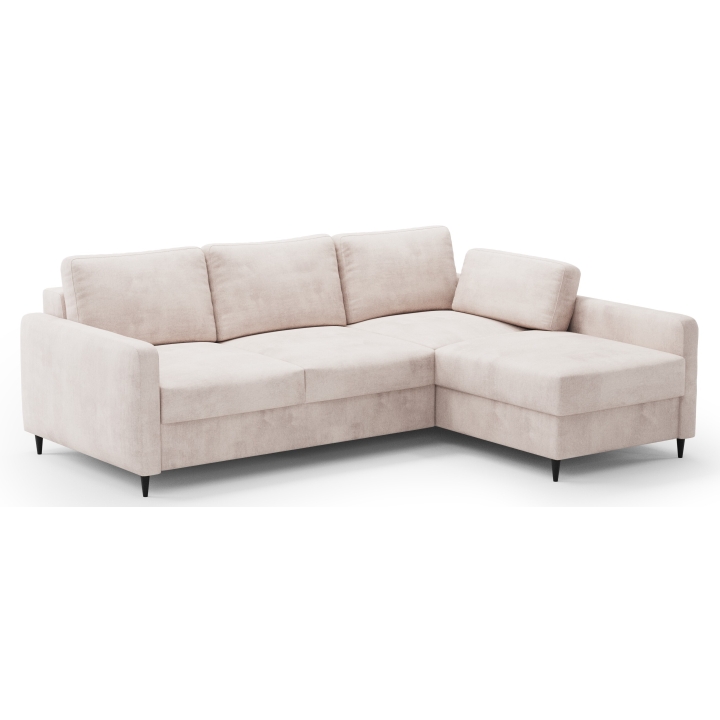 The seat uses a corrugated spring and polyurethane foam to provide adequate flexibility and comfort when sitting. The backrest is also filled with foam and an extra cushion is included to support daily relaxation. The corner sofa is set on high black legs, which emphasise its modern look and make it easier to keep the furniture tidy underneath.