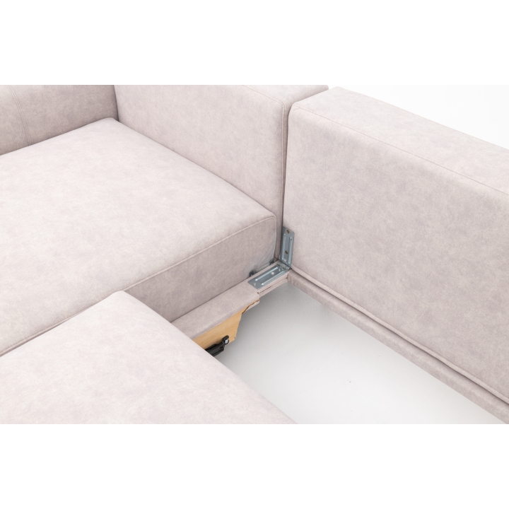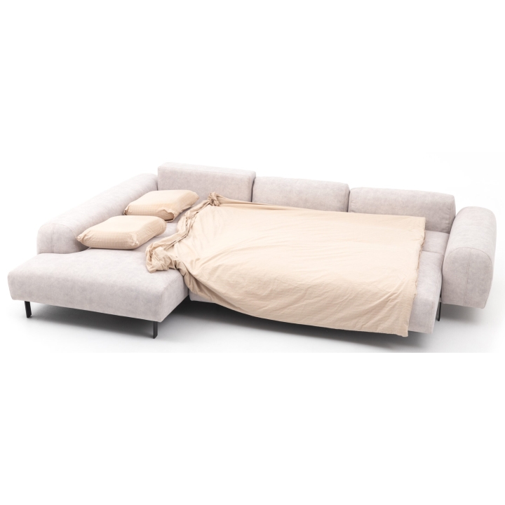 Elegant black metal legs lend the sofa a sense of lightness and make it easier to keep the area beneath clean. Thanks to the automatic DL folding mechanism, the corner sofa can be effortlessly transformed into a comfortable sleeping space. The system works by sliding the seat forward and folding down the backrest to create a sleeping area measuring 140 × 240 cm, perfect for everyday use or guests.