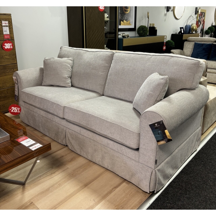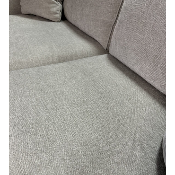 Three-seater sofa in light grey fabric, available from stock. Model measuring 212 cm wide, 92 cm deep, 94 cm high. Sofa without sleeping function, designed with comfort and aesthetics in mind. The fleece-covered high-flexible foam seat provides softness and comfort on a daily basis. Reversible cushions filled with polyester beads allow it to retain its shape for longer.