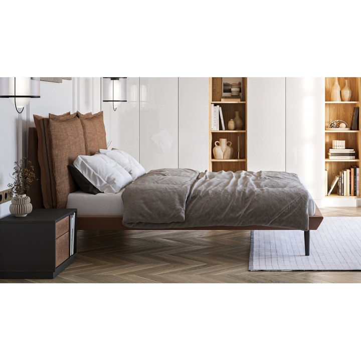 The Forli 140x200 cm upholstered bed without storage box is an elegant piece of furniture that fits perfectly into modern interiors. Made by the New Elegance brand, it is a bed that combines a lightweight design with high legs ( 21cm ) in black, which gives it a unique character. The integrated mattress frame with 22 slats and the comfortable backrest cushions are key advantages of this model, while the choice of two different fabrics allows for personalisation.
