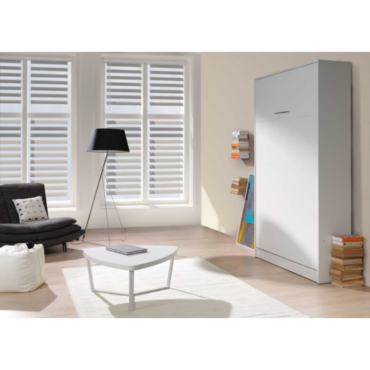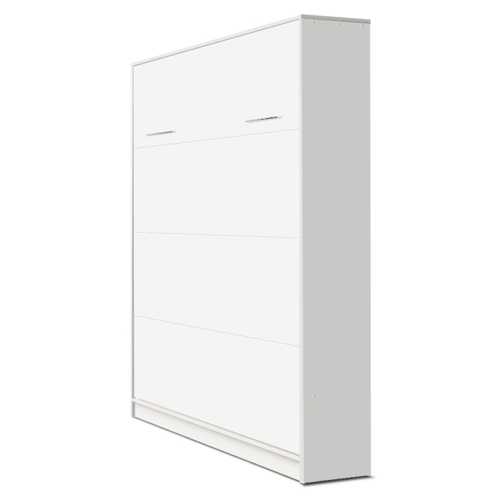 The VB vertical half couch (shelf couch) 120 cm from the renowned company New Elegance Furniture is a piece of furniture that will make you feel comfortable and spacious even in a small room. The modern, designer construction in a minimalist style looks great in Scandinavian interiors, thus guaranteeing many years of durability and resistance to damage. Seemingly simple, the elegant wardrobe is made of laminated board with ABS edging and will blend in perfectly with your interior design. However, with just one move using the convenient handle, a large bed with a sleeping surface of 120x200 cm will slide out of your wardrobe. Importantly, the 120 cm shelf couch is equipped with an opening lock that prevents the bed from folding up on its own, as well as a STOP function that allows you to stop at the right moment. This is completed by a stable metal leg that holds the structure in place.