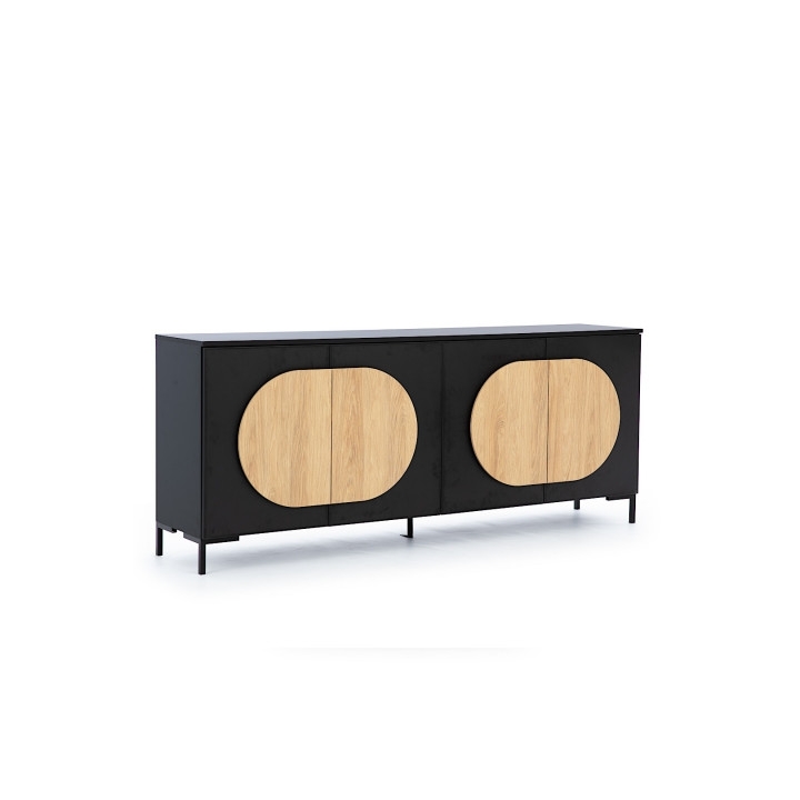 The Ovalo chest of drawers will be a great choice for people who need a lot of storage space. The capacious chest of drawers is sure to provide plenty of space to organise clothes, home textiles or other necessities. A piece of furniture made from a combination of elegant black matt SD-textured furniture board from Pfleiderer's collection and large oval-shaped decorative elements made from oak Hikora board with beautiful wood grain. The chest of drawers will provide four capacious, lockable niches in which to hide all your belongings. The Ovalo chest of drawers is set on high metal legs, which add charm to the piece and make cleaning easier.