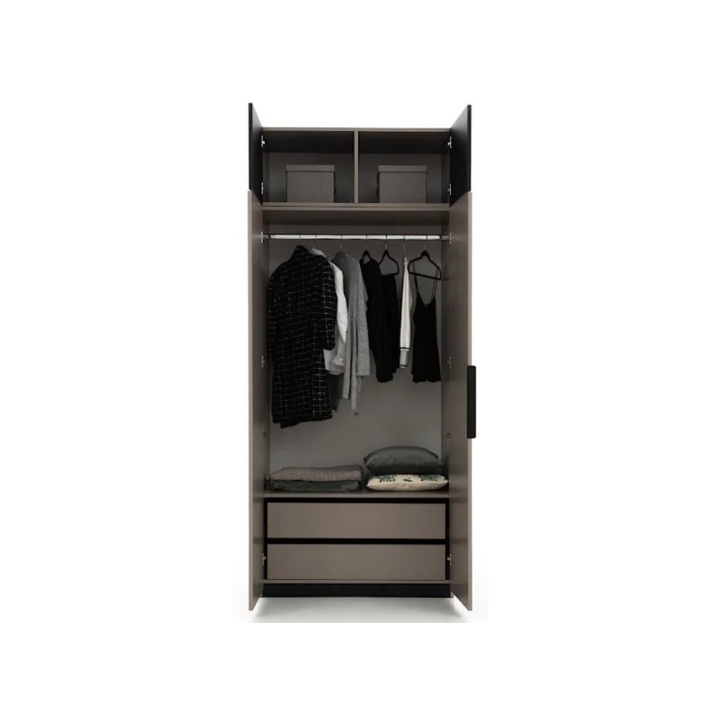 The two-door wardrobe from the Ufficio collection by New Elegance will work well in any room. The Ufficio wardrobe will certainly cope with an excess of clothes, accessories and additions. The furniture is equipped with a pair of high doors concealing capacious storage space and a spacious recess with a clothes bar. The design therefore boasts both a minimalist, lightweight body and contrasting colours. The combination of the congo colour with black matt will give your interior a truly modern look. The wardrobe fits perfectly with the rest of the collection.