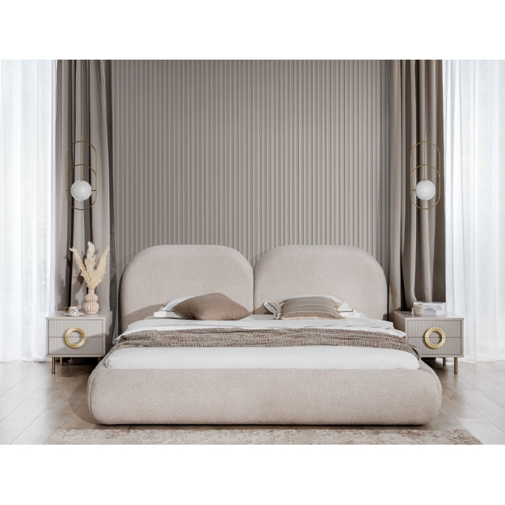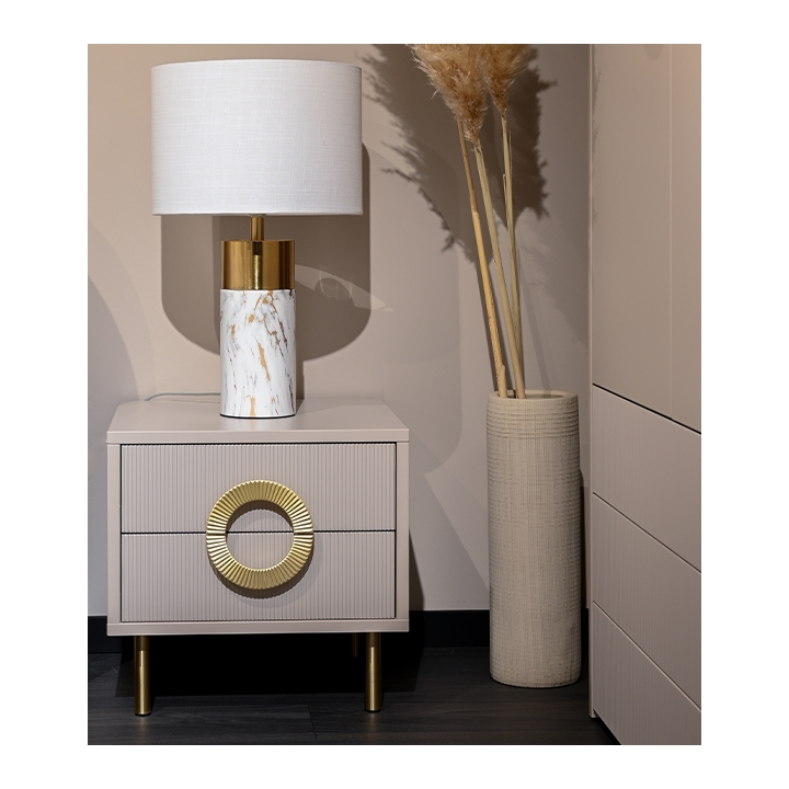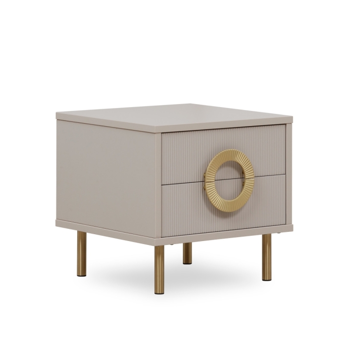 The Nobu bedside table from manufacturer New Elegance is the perfect choice for those looking for a unique piece of furniture for their bedroom. This stylish bedside table in a classic style is made of laminated board and MDF, finished in a fashionable pastel shade of cashmere, close to an elegant beige. The drawer front, fluted in fine stripes, gives the furniture a modern character that blends perfectly with the classic form.