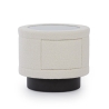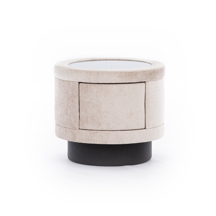 The Nello bedside table from New Elegance is a piece of furniture with a modern design, distinguished by its cylindrical shape and upholstered body. The table is set on a black round base, which gives it stability and contrasting character. The table top, protected by transparent glass, provides protection and a stylish look, blending perfectly with the soft upholstery.