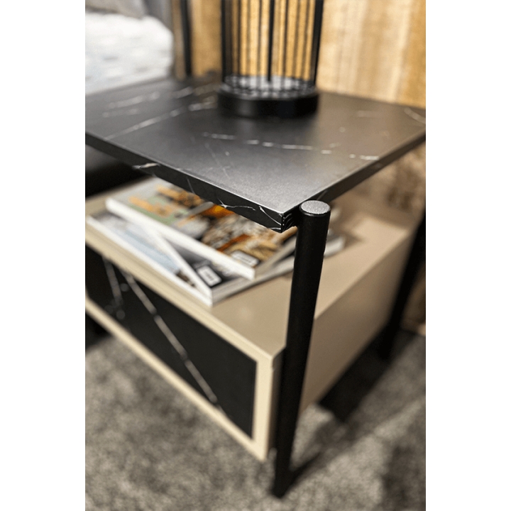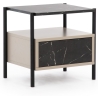 The Marmi bedsidetable from New Elegance is an original piece of loft-style furniture that brings a modern feel to the interior. Its top and the front of the spacious suspended drawer are made of furniture board with a black marble décor, which gives it a unique look. The drawer body in Congo grey beige contrasts perfectly with the black round metal legs, which not only support the structure but also provide an attractive decorative element.