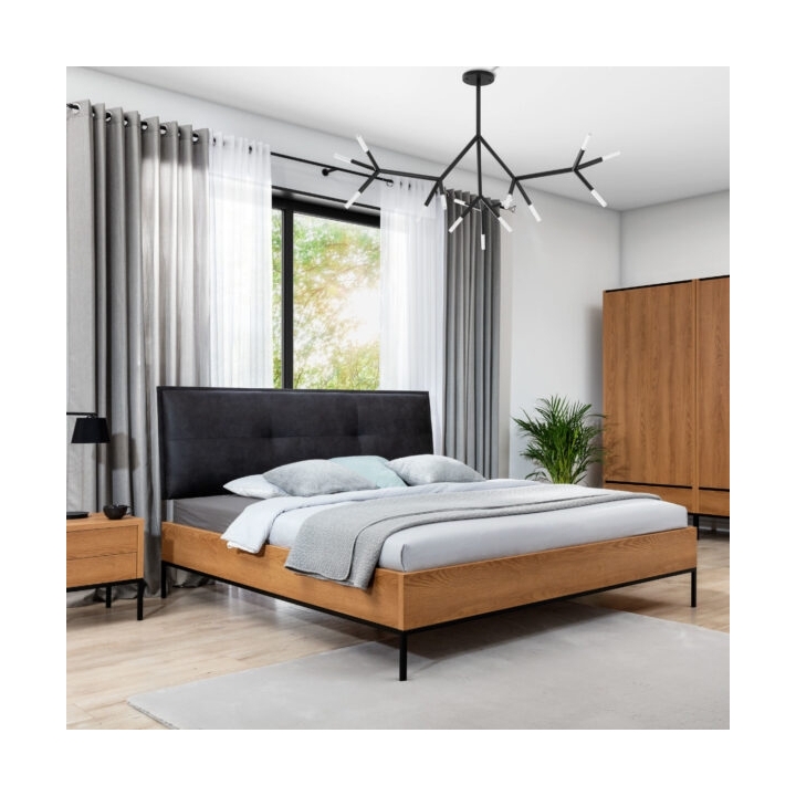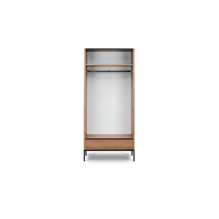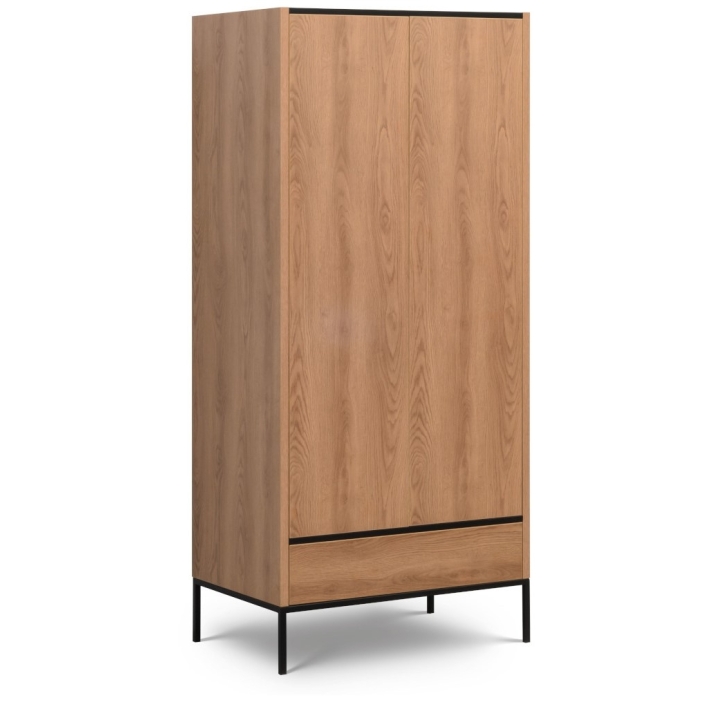 The Loft Karmel two-door bar wardrobe with push & pull opening system is the perfect choice for lovers of minimalist and industrial style. Made by the renowned brand New Elegance, this two-door w ardrobe is created from matt honey oak-coloured furniture board, which perfectly imitates natural wood thanks to its clear grain structure. The black metal frame and legs harmoniously correspond with the horizontal lines that decorate the top panel and separate the drawer from the door, giving the whole a modern character.