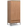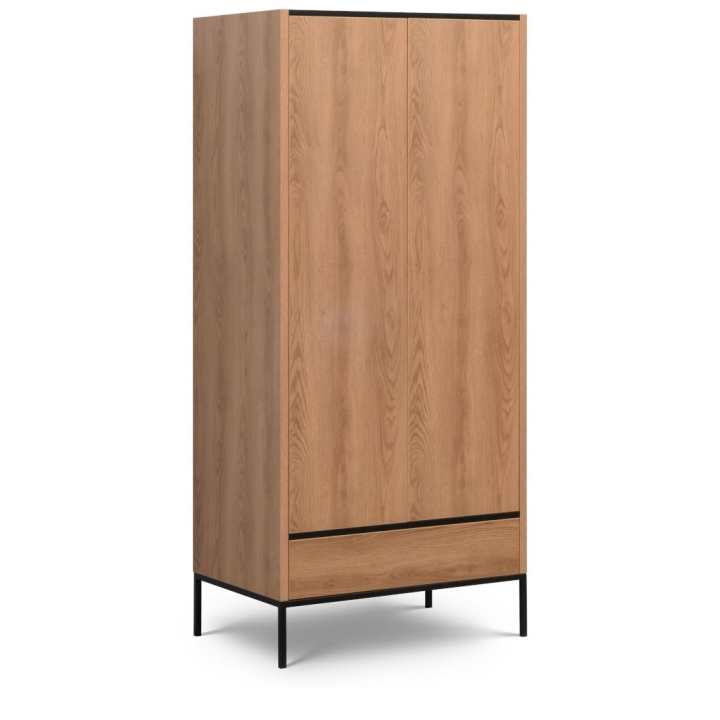 The Loft Karmel two-door wardrobe with shelves and bar, opened with a push & pull system, is the perfect choice for lovers of loft style. Made by the New Elegance brand, this two-door w ardrobe in matt furniture board in honey oak perfectly imitates natural wood. The black metal frame and legs form a harmonious whole with the horizontal lines that decorate the top panel and separate the drawer from the door.