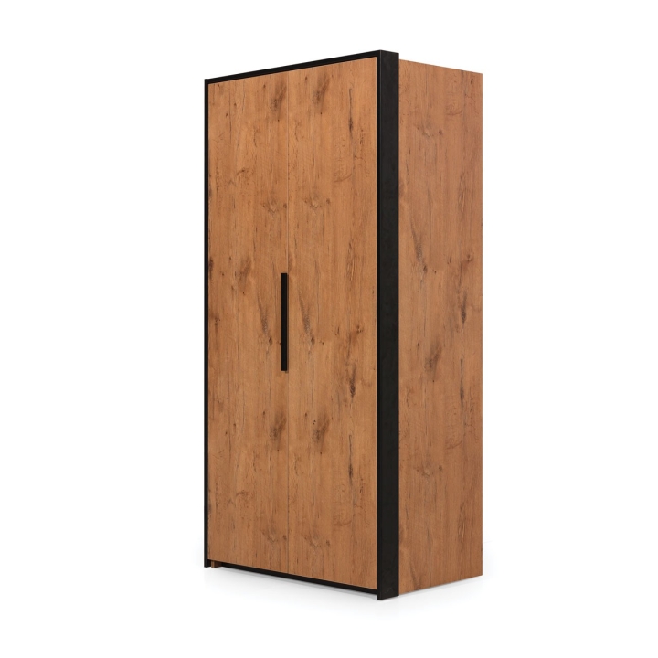 The LFSZ 2D left wardrobe from the Loft collection was created by the well-known manufacturer New Elegance Furniture. The wardrobe adds sublime style and elegance to any interior, and its original design makes it a perfect complement to the decor of industrial and minimalist spaces. The Lof wardrobe with a left-hand side panel provides excellent storage for outerwear as well as home accessories. It is made of durable laminated board in the colour of Lancelot oak, associated with a warm shade of oak - raw and untreated. The brown of the Loft wardrobe contrasts interestingly with the black, giving a sense of reference to the loft style. The wardrobe has a coat rack, two drawers and shelves for clothes and accessories. The Loft wardrobe is also available in a right-hand version.