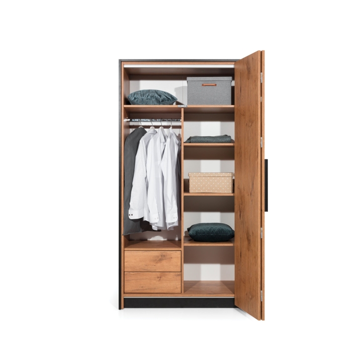 The LFSZ 2D right wardrobe belonging to the original Loft series is a piece of furniture designed by New Elegance Furniture, a well-known furniture manufacturer. The wardrobe with a right-hand side panel goes well with the design of bedrooms and living rooms arranged in industrial and loft style. The Loft wardrobe has been created on the basis of a durable laminated board in an attractive colouring of Lancelot oak, referring to the shade of raw, untreated oak. The brown of the Loft wardrobe contrasts interestingly with the timeless black of the geometric frame, which makes the whole look exceptionally intriguing and stylish. The wardrobe has a practical clothes hanger, two small drawers and numerous shelves for sorting clothes and accessories. In our offer the Loft wardrobe is also available in a left-hand variant.