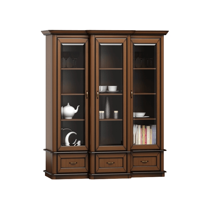 The bookcasefrom the Stylish collection is the ideal piece of furniture to conjure up a beautiful arrangement in the living room, study or dining room. The bookcase has three, glazed doors, decorated with a decorative gold muntin. There is a deep drawer under each door leaf. The furniture will elegantly display beautiful porcelain or other trinkets in the living room or dining room. The furniture is made of MDF board veneered with natural wood. The Stylish collection is the ideal choice for those who appreciate applied, classic elegance, and also want furniture characterised by modern functionality and durability.