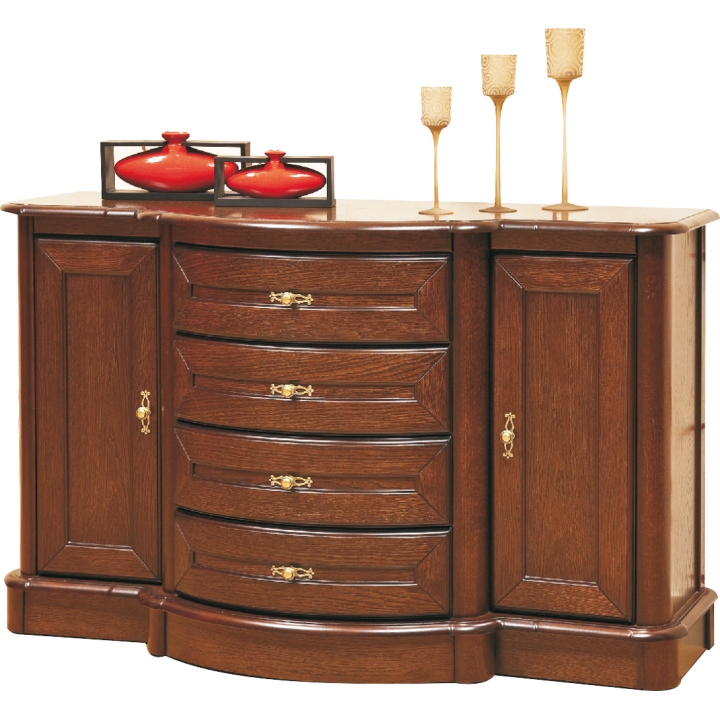 The dresser from the Diana collection isa stylish piece of furniture for the living room, study or bedroom. The furniture has four semi-circular drawers and two doors on the sides. With plenty of space, the chest of drawers allows you to store all the items you need. The design line refers to the best classic forms. A series with simple front divisions, without superfluous ornamentation, in order to make the natural grain layout visible. The furniture is made of solid wood and natural veneers, making it strong and durable.