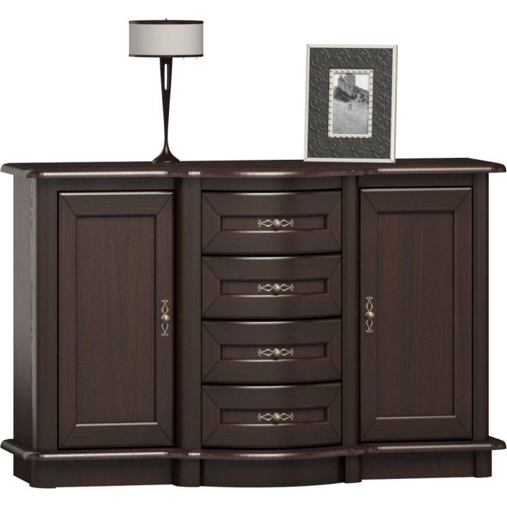 The large chest of drawers from the Diana collection is a tasteful piece of furniture that will help you compose a stylishly refined living room or dining room. The furniture is available as standard in two traditional wood colours: walnut or antique cherry. Made of MDF veneered with natural oak; also features solid wood elements. The chest of drawers has four semi-circular drawers and two doors on the sides. With plenty of space, the chest of drawers allows you to store all the items you need and the mirror adds to its charm. The pronounced structure, the texture of the noble raw material that can be felt under the fingers, allows you to feel close to nature.