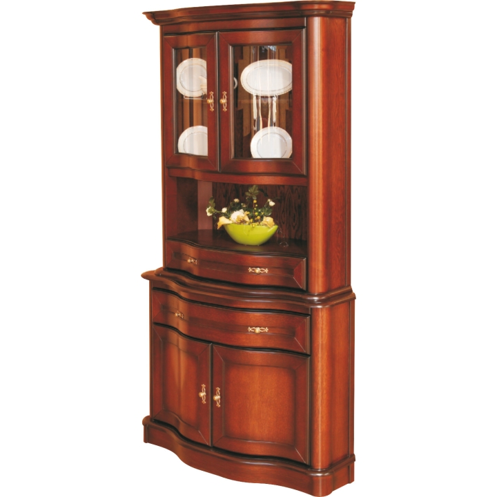 The Fala cabinet is ideal for the living room or dining room, thanks to which you can even create storage space in the corner. The sideboard will be perfect in combination with the Fala chest of drawers. The dresser has two doors and a capacious drawer above them. The sideboard has two glazed doors decorated with a sandblasted ornament. The furniture is made of MDF board veneered with natural oak and solid wood. The soft forms and colouring in shades of walnut create a pleasant image to the eye. A noble touch is added to the overall look by the high-quality, meticulously modelled brass handles.