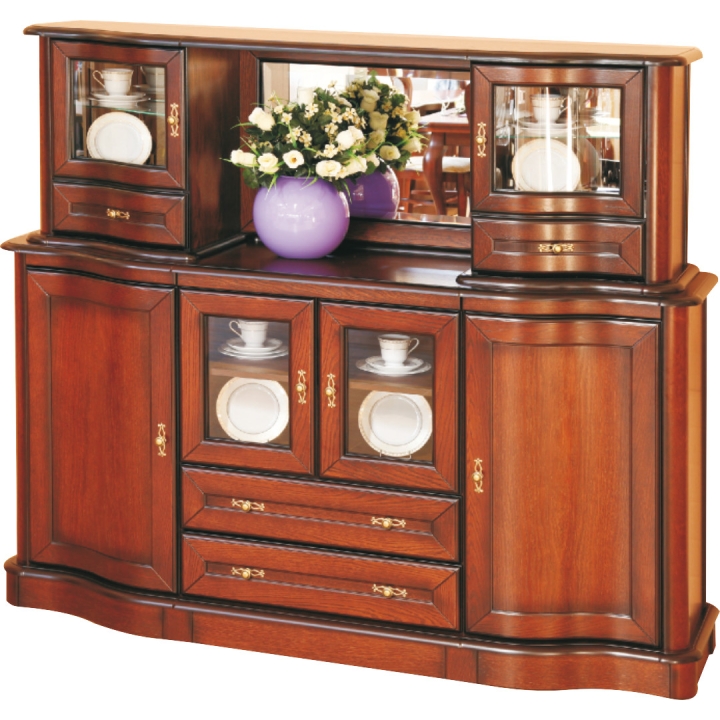 Are you looking for a stylish piece of furniture for your living room? The Fala chest of drawers from the Fala collection is the perfect piece of furniture for lovers of traditional solutions. The chest of drawers has a centrally placed glass door with two capacious drawers underneath and two doors on the sides. The extension is a combination of decorativeness and elegance. The upper cabinet has a mirror in the central part and two symmetrically placed glass doors on the sides with drawers underneath. This model is ideal for the dining room or living room. The furniture is made of MDF board veneered with natural oak and solid wood. All maintained in gentle forms and coloured in shades of walnut are a pleasant image to the eye.