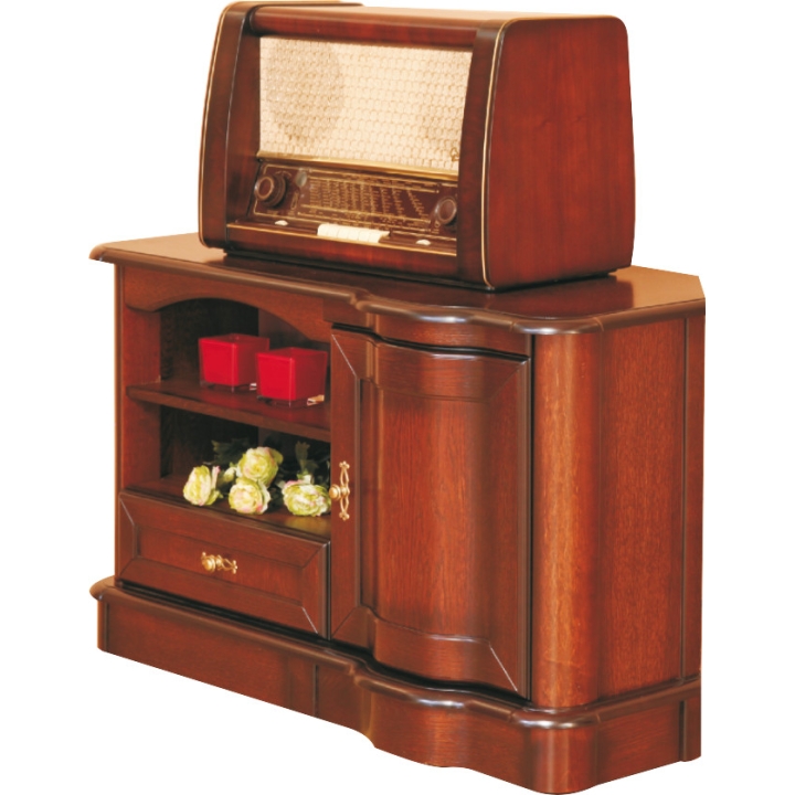 The RTV table from the Fala collection is an elegant, stylish piece of furniture that will add charm to any TV corner. The furniture has two niches and a useful drawer on the left side, and one door leaf on the right side. The noble character is added to the whole by the high-quality, meticulously modelled brass handles. The gentle wave shape of the furniture adds elegance to the table. The entire piece, which is maintained in gentle forms and coloured in walnut tones, is a pleasing image to the eye.