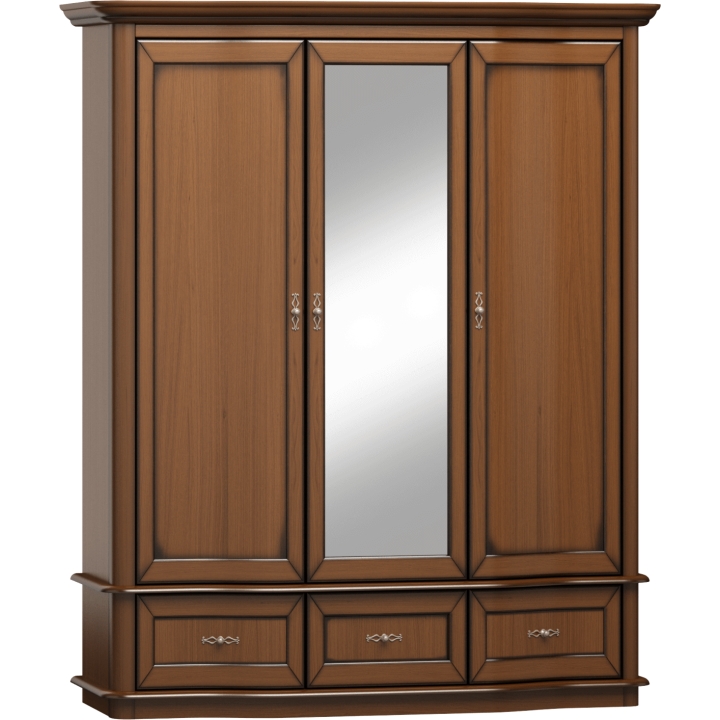 The wardrobe from the Fala collection is a stylish piece of furniture, which was made of solid wood and elements of natural oak veneer. Elegance and high functionality make it a very interesting proposition for demanding clients. It is a massive piece of furniture, which emphasises its classic and elegant character with its simplicity and details. The wardrobe consists of a three-door front and three drawers. Such a structure makes the piece of furniture sure to provide space for an entire wardrobe. The entire wardrobe has been maintained in gentle forms and the colouring in shades of walnut provide a pleasant image to the eye. The wardrobe also has a mirror placed on the front, which is both a decorative and practical element.