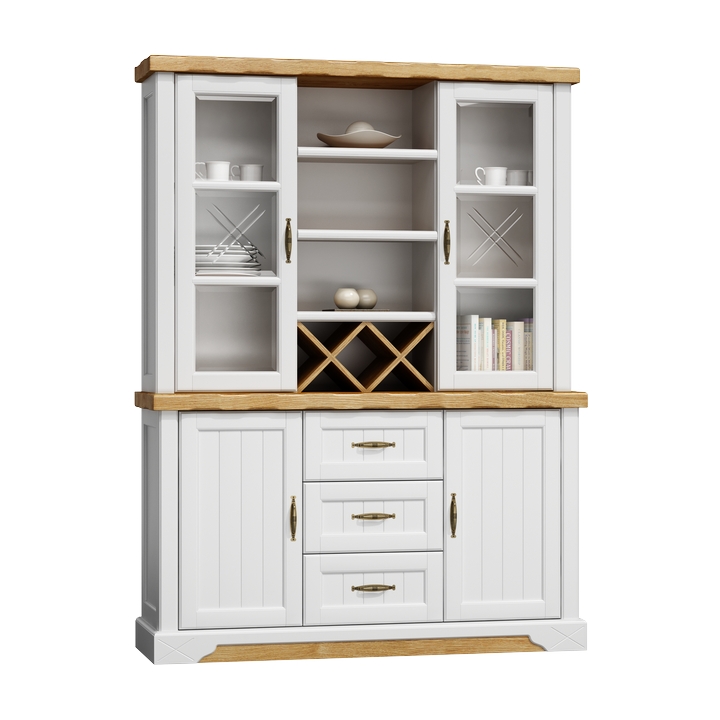 Do you like classic beauty? Opt for furniture from the Monaco collection! The furniture consists of cabinets, drawers and glazed fronts. The beautiful combination of the warm colour of oak with white makes this unique piece of furniture look extremely light and chic. The partial glazing of the upper wings will allow you to display your favourite items, such as tableware or wine glasses, while protecting them from dirt and external influences. Carefully selected handles and thoughtful aesthetics in the pedestal design complete the stunning look.