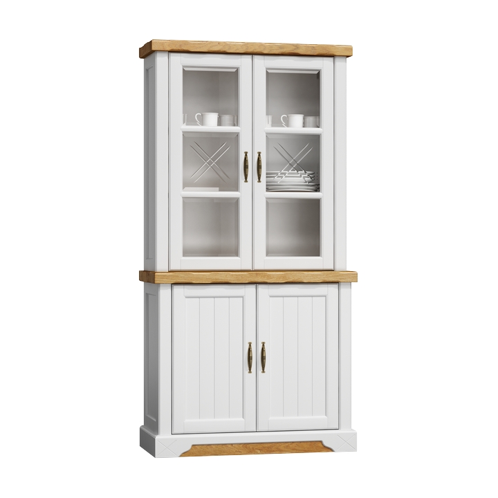 Are you a fan of classic furniture characterised by simplicity and versatility. Choose the Monaco collection! The beautiful combination of the warm colour of oak with white makes this unique piece of furniture look extremely light and chic. The partial glazing of the upper wings will allow you to display your favourite items, such as tableware or wine glasses, while protecting them from dirt and external influences. The lower part of the furniture contains shelves that will allow you to store a variety of household accessories. Carefully selected handles and thoughtful aesthetics in the design of the plinth complete the stunning look.