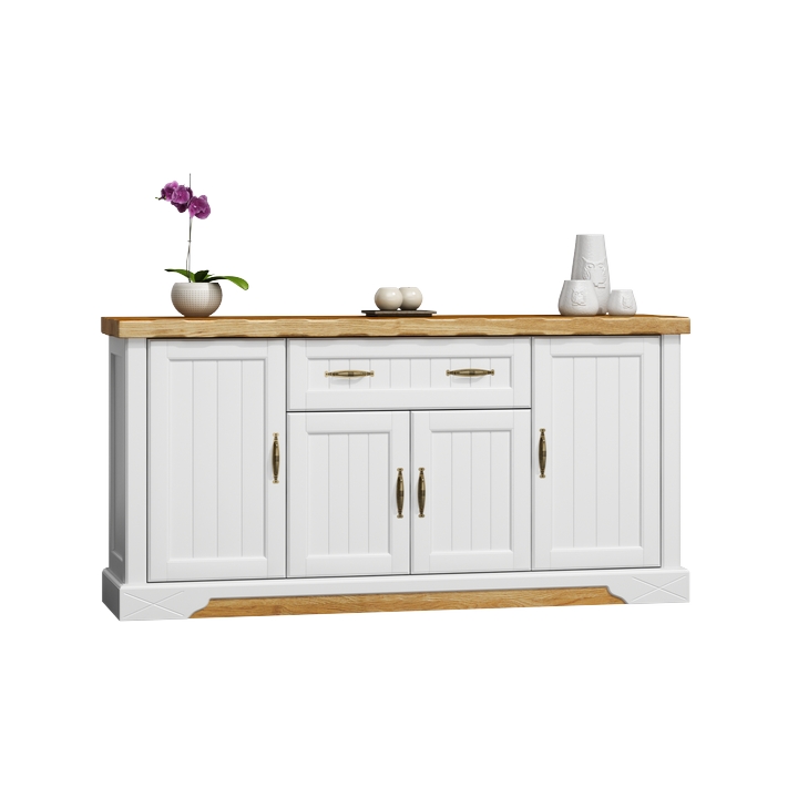 The large, capacious chest of drawers from the Monaco collection is a stylish piece of furniture that delights with its simplicity and versatility. The product is equipped with one large drawer and storage compartments hidden behind a double pair of doors - such a design guarantees the possibility of proper sorting of items, so you will always have quick and easy access to them. A chest of drawers is a piece of furniture that cannot be missing in any stylish interior! It is a piece of furniture like no other, but allows you to bring harmonious order to your home. The pure, pristine white is combined with a deeply brushed top in the colour of nature, which adds to the collection's appeal. Carefully selected handles and thoughtful aesthetics in the design of the plinth complete the magnificent look.