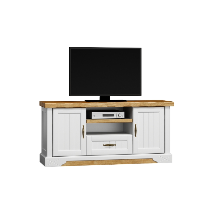 The RTV chest from the Monaco collection consists of two cabinets, a shelf for electronic equipment and a drawer. Carefully selected handles and thoughtful aesthetics in the design of the plinth complete the stunning look. The pure, pristine white is combined with the deeply brushed natural-coloured top, which adds to the collection's appeal. The RTV chest will perfectly complement a living room decorated in a modern or Scandinavian style. The brushing in the Monaco collection has different densities to give it a unique style. The waxed, oiled tops, which have been topped with regular sprucing, add a modern touch to the piece.