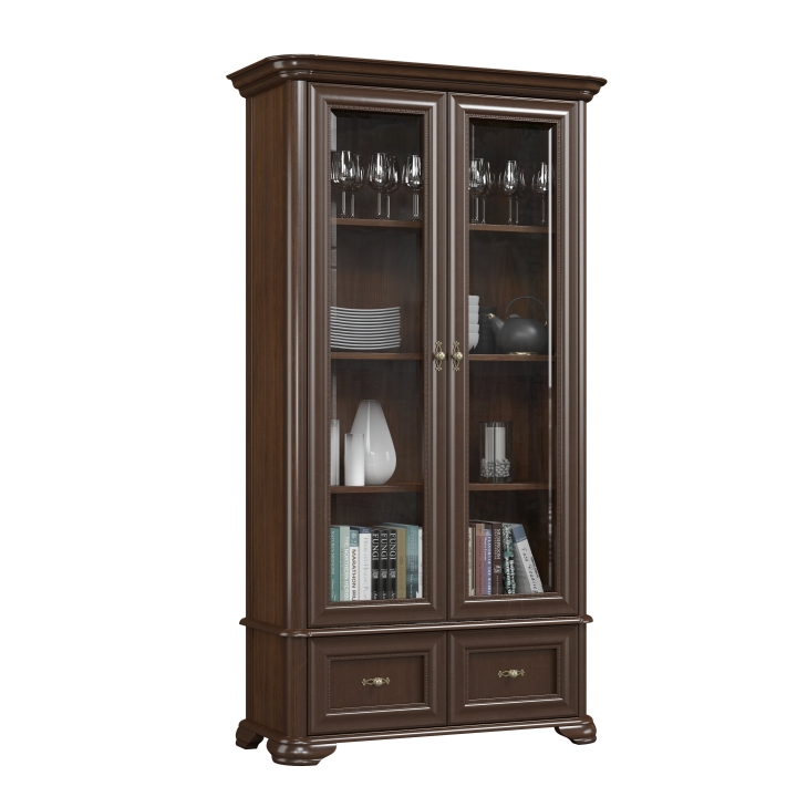 Elegant library from the Stylish II collection with a design inspired by the best traditions of furniture art. The bookcase has two, glazed doors, decorated with a decorative gold muntin. Under each door leaf there is a deep drawer. Thanks to the geometric cuts, this collection has a definite character. It is available in the colours: W 101 walnut, W 105 antique cherry. The collection is characterised above all by simplicity of form and a minimalist style.