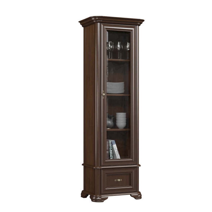 The Stylish Library II is one of the pieces of living room furniture. The bookcase has one glazed door leaf, decorated with a decorative gold muntin. There is a deep drawer under the door leaf. The structure of the piece of furniture makes it possible to display beautiful porcelain or other trinkets in the living room or dining room. Thanks to the geometric cuts, this piece of furniture has a definite character. It is available in the following colours: W 101 walnut, W 105 antique cherry. The Stylish II collection is an excellent choice for lovers of traditional furnishings looking for new high quality products.