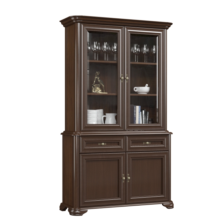 The Stylish Showcase II is a capacious piece of furniture that will surely hold your favourite collections of glass, porcelain or beautiful decorations. This elegant product allows you to aesthetically display your most precious treasures and will protect them from contact with dust and airborne moisture. The Stylish II collection is an excellent choice for lovers of traditional furniture who are looking for new high-quality products. Additionally, you can combine the showcase with a chest of drawers. Thanks to the geometric cuts, this collection has a definite character. The furniture is available in the colours: W 101 walnut, W 105 antique cherry.