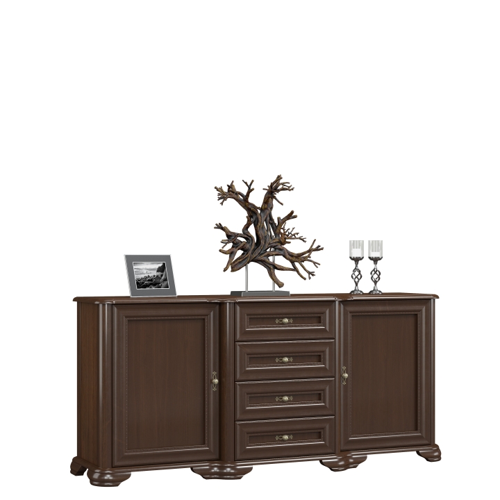 The Stylish II chest of drawers is a design inspired by the best traditions of the art of furniture making. The furniture consists of four drawers and two cupboards. It will certainly provide space to organise all your household accessories. The large top is an excellent space for setting up decorations, photos and any trinkets. The Stylish II collection is an excellent choice for lovers of traditional furnishings who are looking for new high quality products. Thanks to the geometric cuts, this collection has a definite character. The furniture is available in the following colours: W 101 walnut, W 105 antique cherry.