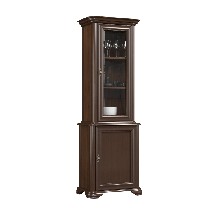 The tall display cabinet from the Stylish II collection is a design inspired by the best traditions of furniture making. The display cabinet is perfect for storing tableware or as a home library. The fronts of the display cabinet are glazed, while the glass has been bevelled. The furniture is characterised by a complex design, using surface folds and smooth bends inspired by solutions from the early 20th century. The collection is characterised above all by simplicity of form and a minimalist style. Thanks to the geometric cuts, the collection has a definite character. It is available in the colours: W 101 walnut, W 105 antique cherry.