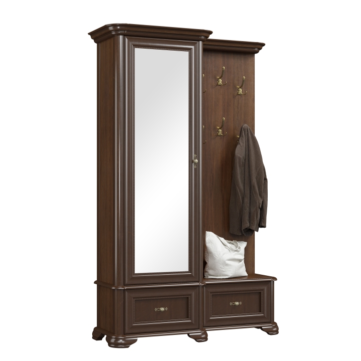 The Stylish II collection is characterised above all by simplicity of form and a minimalist style. Thanks to the geometric cuts, the collection has a definite character. The hallway in walnut colouring looks extremely elegant. The furniture consists of a lockable cabinet with a mirror on the front. There are also two drawers and a panel with hangers. The furniture will certainly provide space for storing outerwear and shoes. The individual machining and handmade workmanship adds a specific flavour to each individual piece.