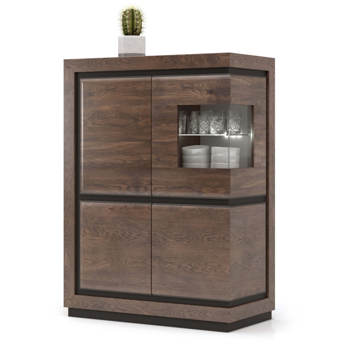 The bar from the Inferno collection is a piece of furniture that will sensationally complement modern style interiors. A characteristic feature of this collection is the natural materials used in its production: wood and oak veneer. The grain of the furniture fits perfectly into classic interiors, while also giving an exclusive look. The Inferno bar is a solid piece of furniture that is sure to stay with you for years! The optional lighting of the glass shelves definitely adds to the glamour. The bar is both a place to display decorations and a space for storage. Thanks to the original geometric shapes, you can create an interesting interior design.