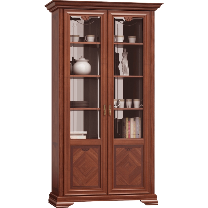 The library from the Milano collection consists of two doors in a combination of wooden workmanship and glazing. It fits perfectly into the classic style while adding charm and prestige. The laser-cut ash veneer adds elegance and uniqueness. The furniture is made of solid ash wood, which is present in the legs, crowns, vertical posts and front frames. The highlight of the furniture is the silent closing system. Richly decorated fronts and brass handles give the collection a unique atmosphere. The warm colouring of the furniture in a cognac shade will make the room decor cosy.