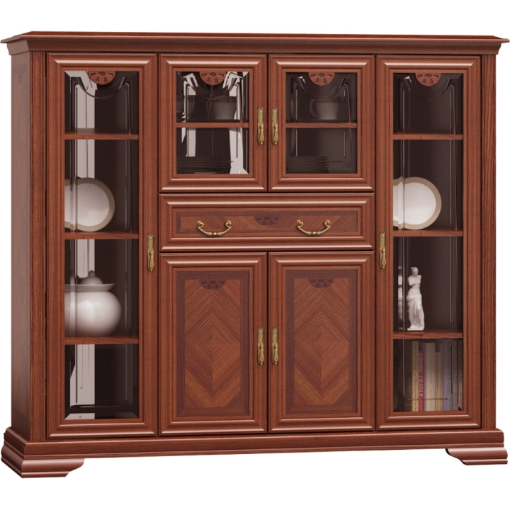 - DESIGN: Fronts - ash veneer in the form of intarsia, frame - solid ash wood, ground glass. Drawers - solid ash wood and natural ash veneer. Body - furniture board with ash veneer. Crown, legs and corners - solid ash wood.