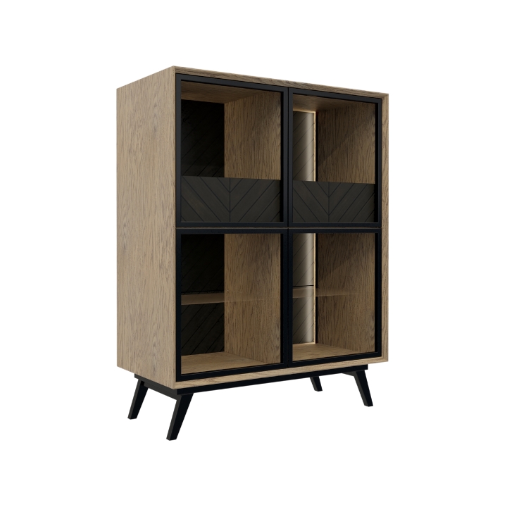The 4D 1S Larte L5 glass bar offers four glazed doors, three shelves and one drawer for convenient storage of spirits, glasses and other accessories. The interior of the bar impresses with its meticulous finish, and the black drawer blends in perfectly. An additional feature is the modern LED lighting, activated by proximity, which creates a pleasant atmosphere during social gatherings.