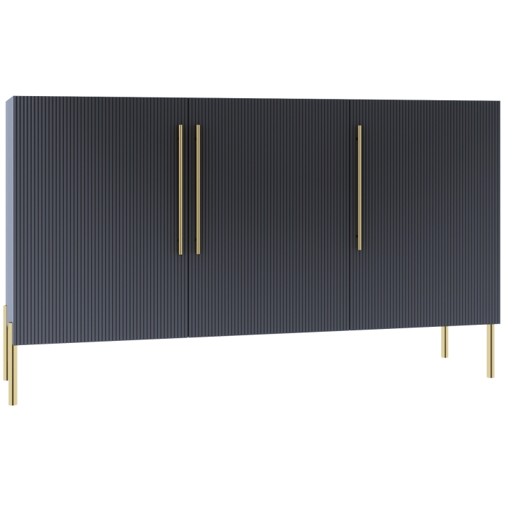 Made from MDF , the furniture is distinguished by its solid body and fronts with striking fluting. The gold brushed legs and handles add a unique touch. The chest of drawers has three doors, with one shelf behind each, allowing for a variety of space arrangements.