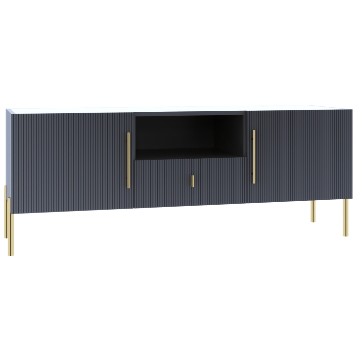 Made from MDF veneered board, the 2D1S RTV table features a solid construction and fluted fronts that give it a unique character. Two door fronts located on the sides and one central drawer provide ample storage space. The gold brushed legs and handles add to the overall elegance and emphasise the modern style of the furniture.