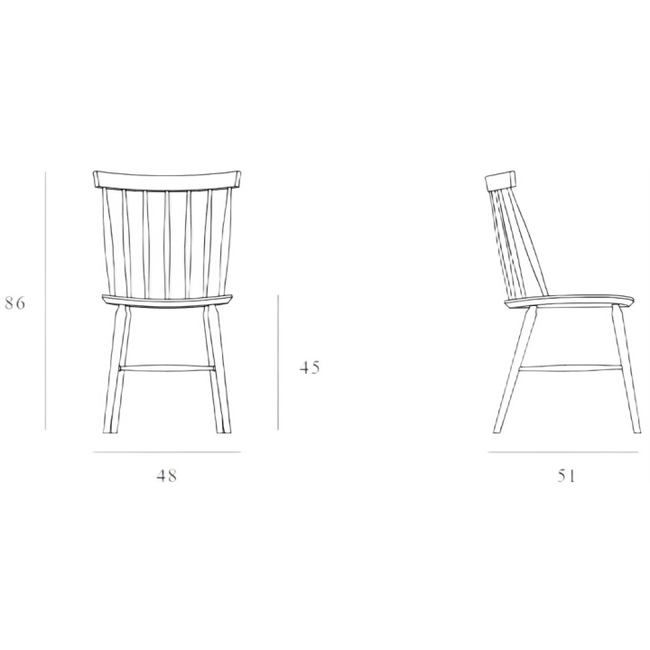The dimensions of the chair are 48 cm wide, 86 cm high, 51 cm deep and the seat height is 45 cm. The seat of the furniture is plain or upholstered, and there are over 300 fabrics to choose from. With such a large choice of both wood and upholstery colours, many different configurations can be created such as a colour contrast with dark upholstery and light wood or a harmonious composition of light fabrics and a beautiful light wood texture.