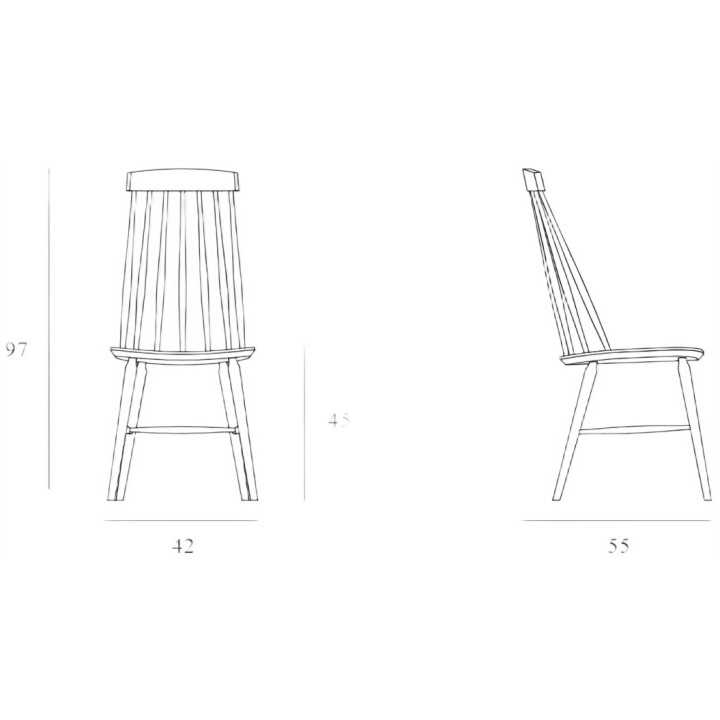 The wood colouring is available in a number of stains, so the furniture will suit rooms of any style. The dimensions of the chair are 42 cm wide, 97 cm high, 56 cm deep and the seat height is 45 cm. The seat of the furniture is either plain or upholstered, and there are over 300 fabrics to choose from. With such a large choice of both wood and upholstery colours, many different configurations can be created such as a colour contrast with dark upholstery and light wood or a harmonious composition of light fabrics and a beautiful light wood texture.