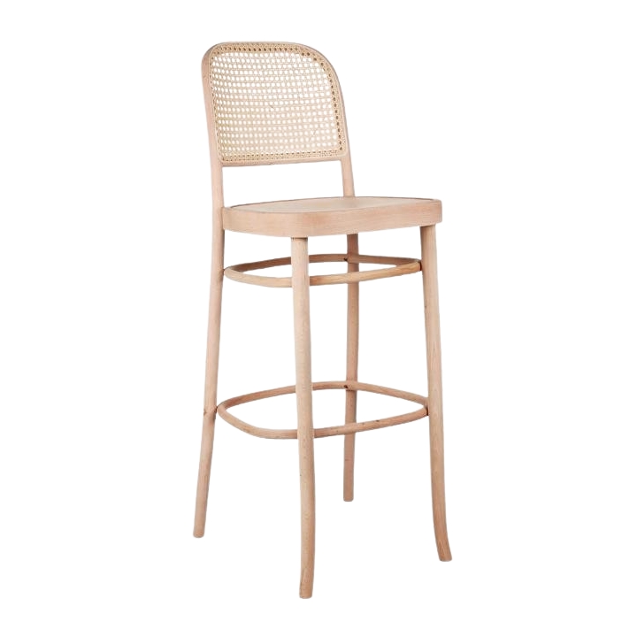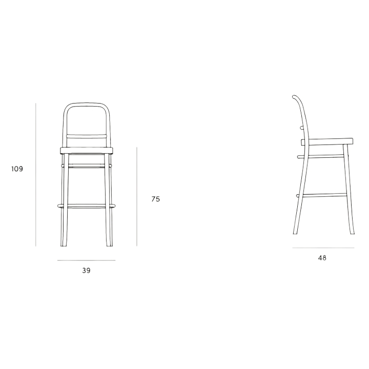 The dimensions of the chair are 39 cm wide, 109 cm high, 48 cm deep and the seat height is 75 cm. The seat of the chair is made of solid wood and there are many shades to choose from. With a large selection of both wood colours, you can create a truly stylish piece of furniture.