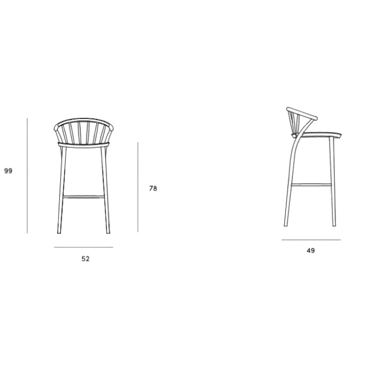 The dimensions of the chair are 52 cm wide, 99 cm high, 49 cm deep and the seat height is 80 cm. The chair's unique design is evidenced by its rounded legs, which create a unique structure. The stylishly curved backrest makes the piece of furniture extremely stable and durable.