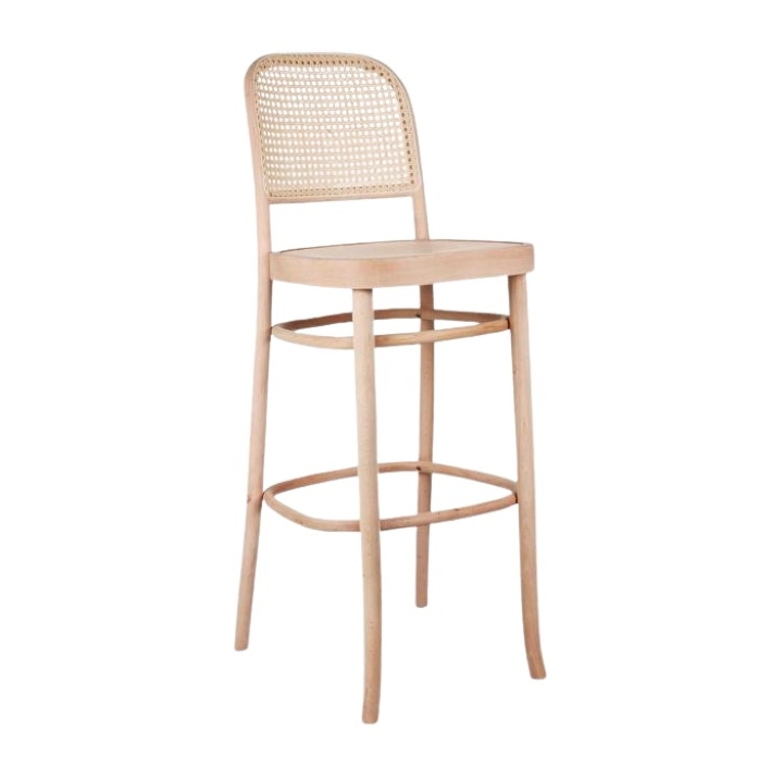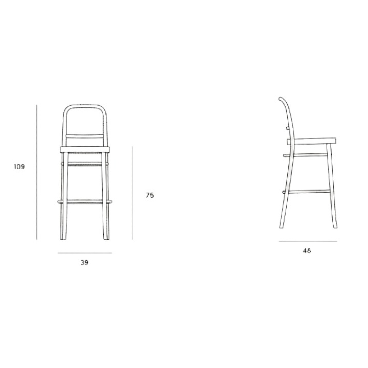 The dimensions of the hocker are 39 cm wide, 109 cm high, 48 cm deep, and the seat height is 75 cm. The trendy design of the solid is influenced by the mat of which the backrest is made, as well as the classic, timeless look.