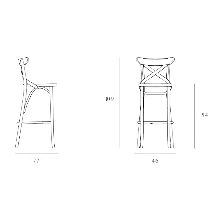 The dimensions of the hocker are 46 cm wide, 109 cm high, 54 cm deep, and the seat height is 79 cm. The fashionable design of the solid is influenced by its unique backrest with an interesting structure.