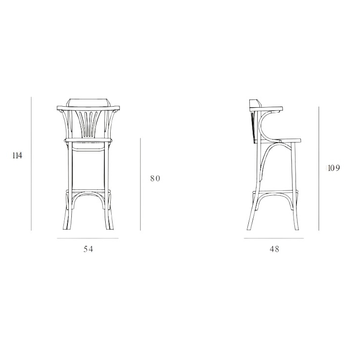 The dimensions of the hocker are 54 cm wide, 114 cm high, 48 cm deep and the seat height is 80 cm. The fashionable design of the solid is influenced by its unique backrest with an interesting structure.