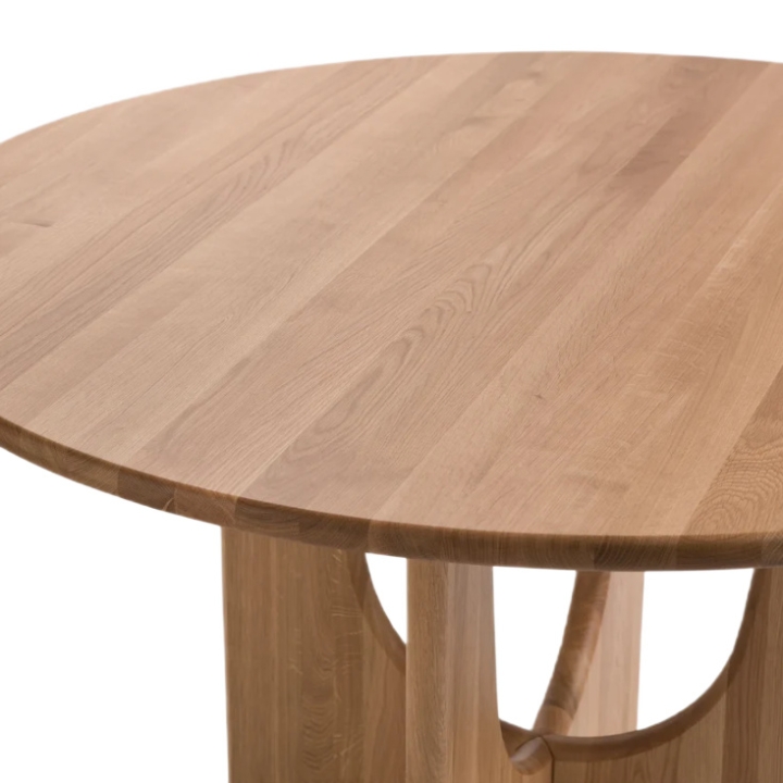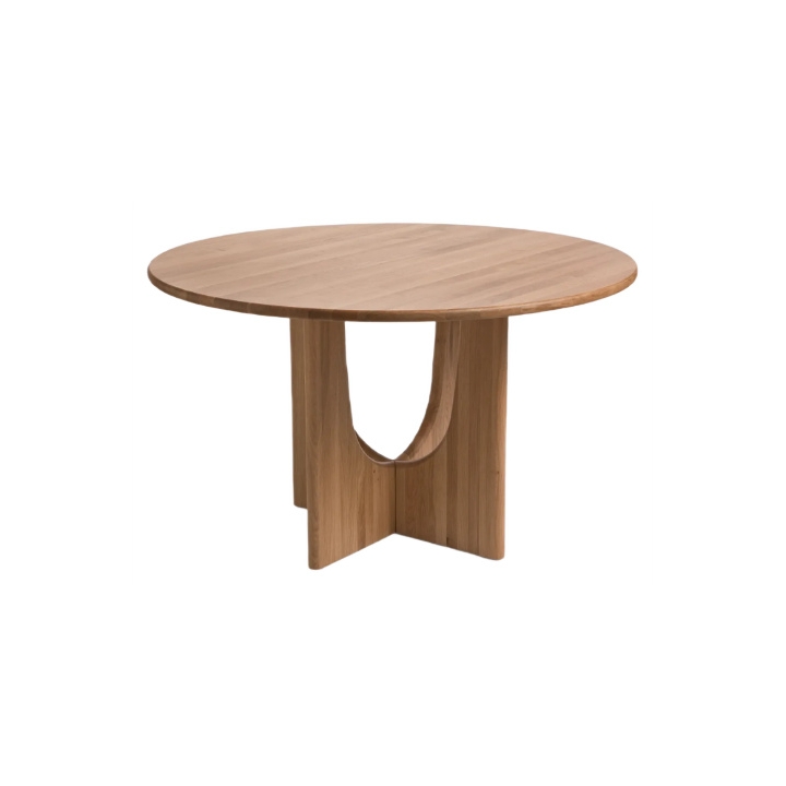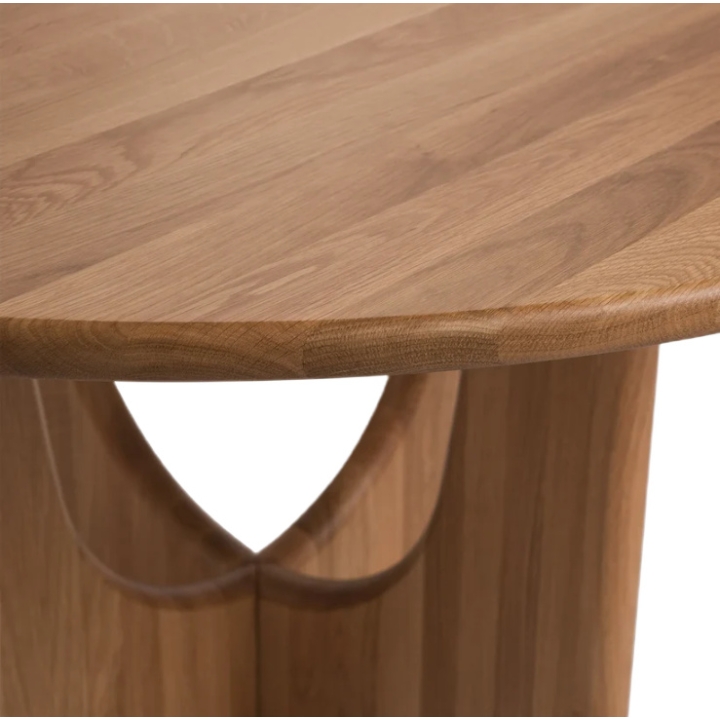 The Sund Round table with a diameter of 130 cm and a height of 76 cm is made of solid oak wood, which ensures high durability and resistance to everyday use. The round tabletop rests on a distinctive cross base, which gives the form a sense of lightness. This type of base allows for comfortable chair placement from all sides without limiting legroom for people seated at the table.