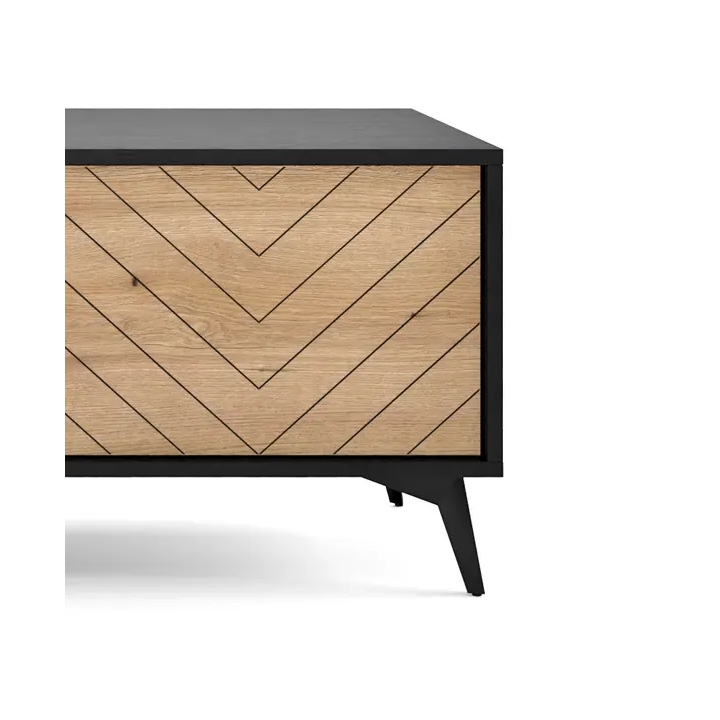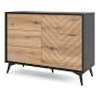 With a width of 104 cm and a height of 77 cm, it will find its perfect place in the living room as well as the bedroom or the youth room. And its look? The combination of the Evoke oak fronts with the black body gives it a distinctive look that fits in perfectly with modern interiors.
