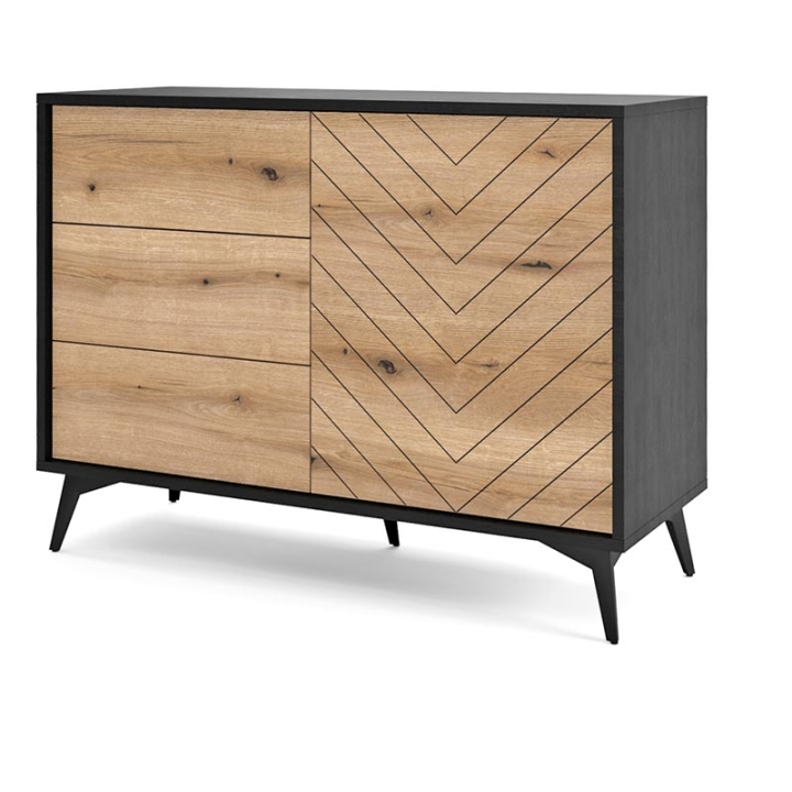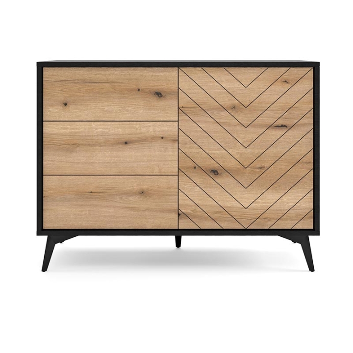 What does it hide inside? A cupboard with a shelf and three drawers that can hold everything from clothes to documents to everyday essentials. And if you like characterful details, you will surely notice the front with its decorative herringbone pattern - a subtle accent that sets the chest of drawers apart from the rest.
