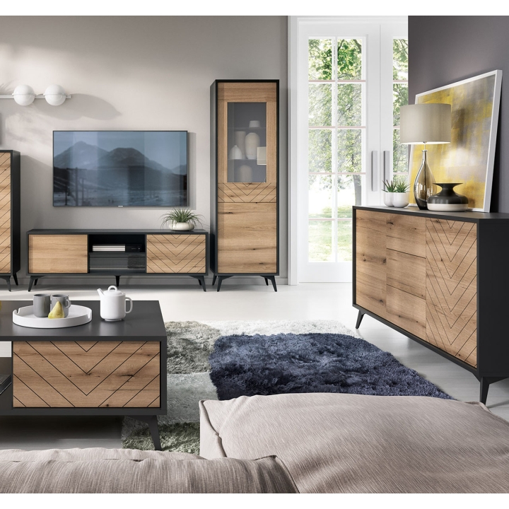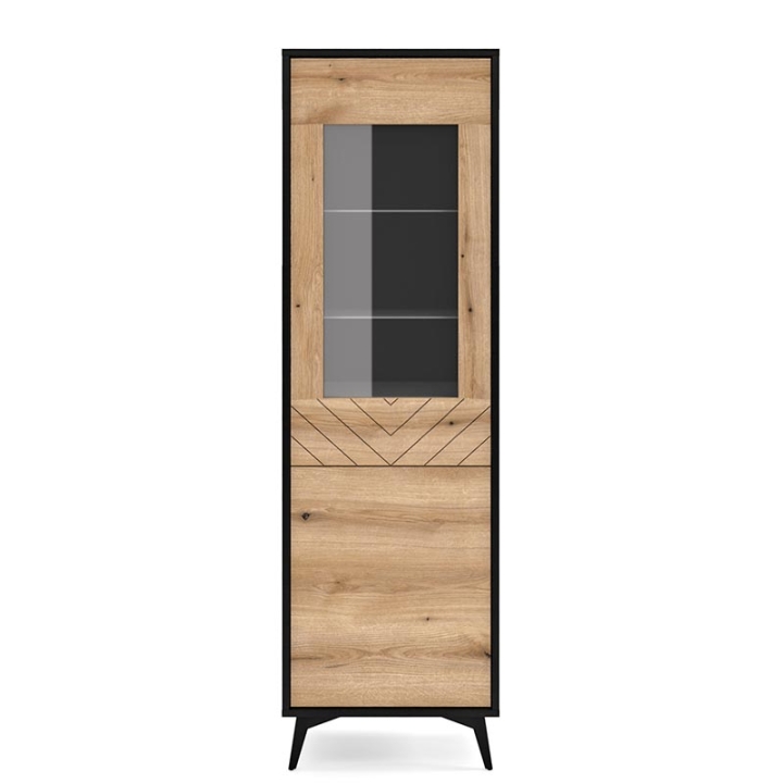 The black solid with the front in oak evoke creates an expressive duo, which finds its perfect place in interiors decorated in industrial, modern or even modern classic style. The display cabinet measures 178 cm high and 54 cm wide - it is these proportions that make it fit easily into both spacious living rooms and smaller dining or living rooms. Already have a place in mind where it could stand?