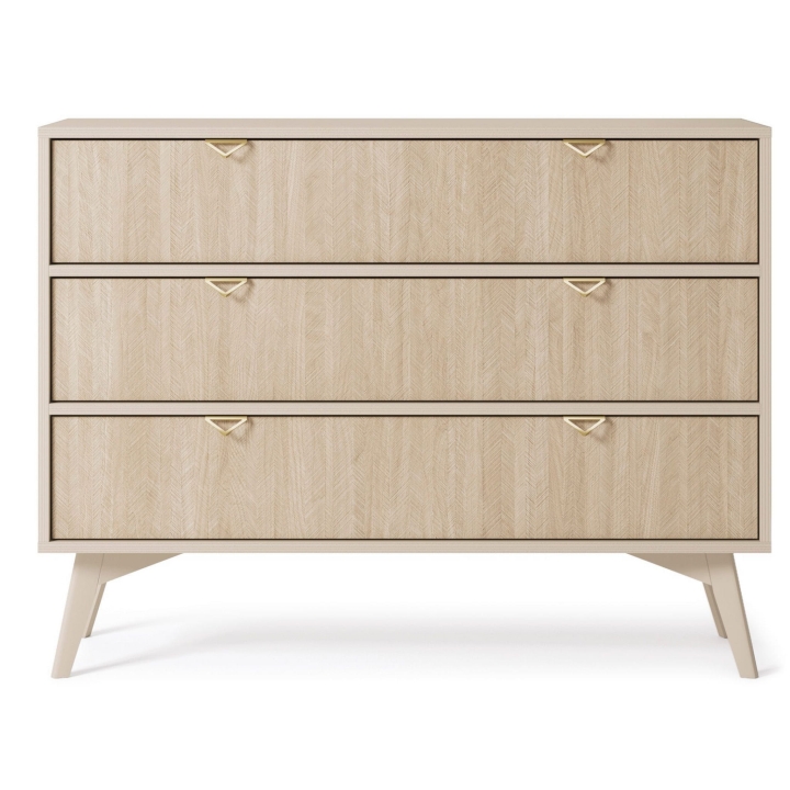Its unique character is emphasised by the front with a decorative herringbone scandi pattern, which is an eye-catcher and gives the interior a cosy feel. The golden triangular handles, designed especially for this collection, add a subtle elegance, while the solid wooden legs in the colour of the body ensure stability and lightness of the structure.
